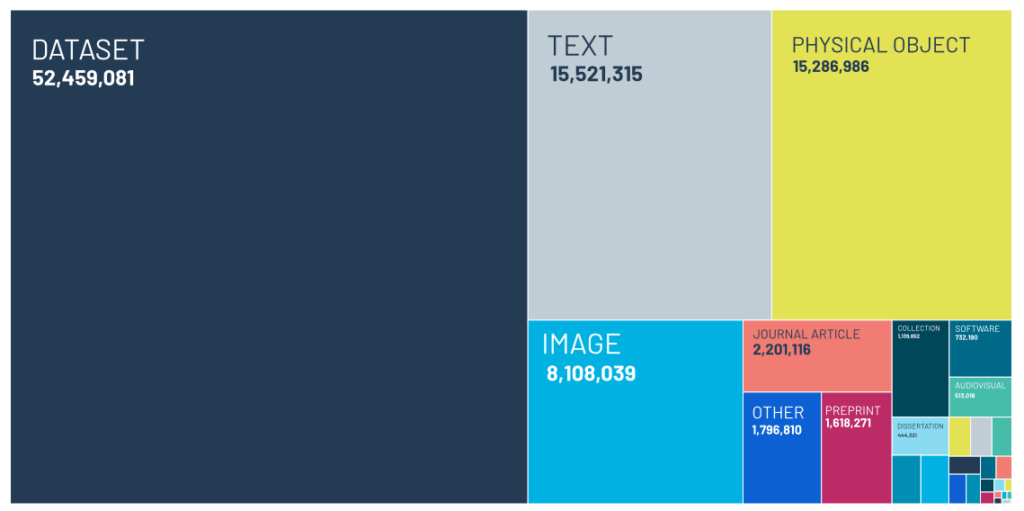 The 100 million DOIs in DataCite represent the full spectrum of research organization activities around the globe, encompassing datasets and software, preprints and dissertations, physical objects and instruments, research data management practices and research projects, grants and awards.
